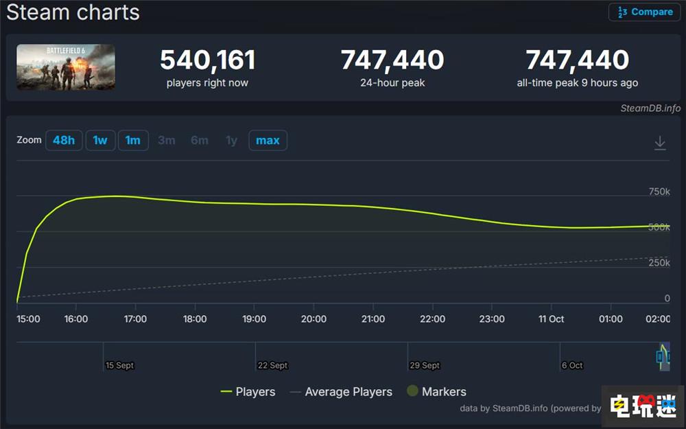经过EA酝酿多年的《战地》系列新作《战地6》于10日晚上正式解锁,作为一款备受期待的多人竞技游戏,PC平台的Steam玩家同时在线峰值达到了惊人的74.7万,超越了Beta时的52.1万,真是让人感到振奋!